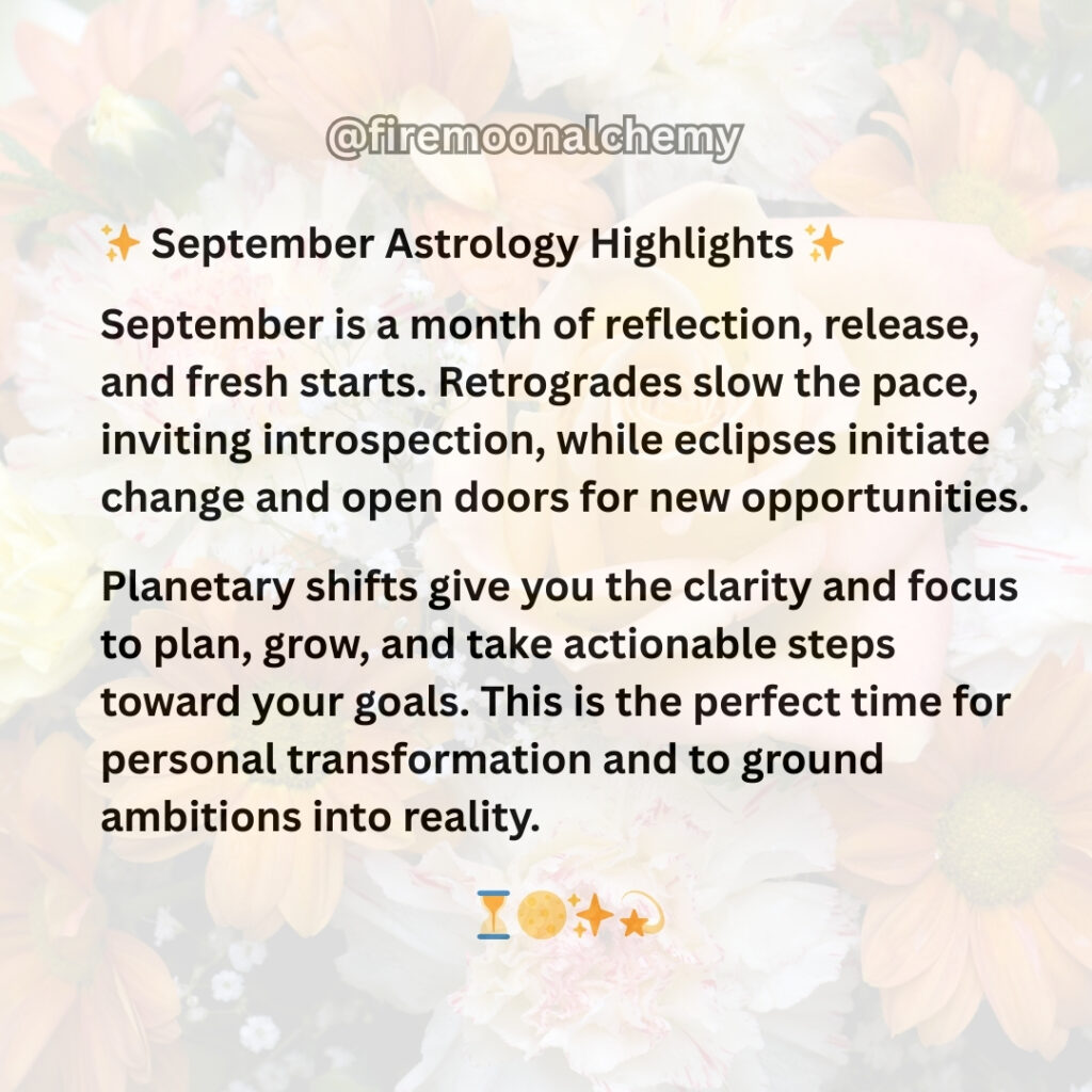 Powerful shifts and fresh beginnings are on the horizon! The Pisces Lunar Eclipse clears away what you’re ready to release, while the Virgo Solar Eclipse plants the seeds for new opportunities. With Mercury and Venus offering supportive energy and Mars entering Scorpio later in the month, September is an ideal time to take action and bring your ideas to life. (For more details on these transits, see my previous post).